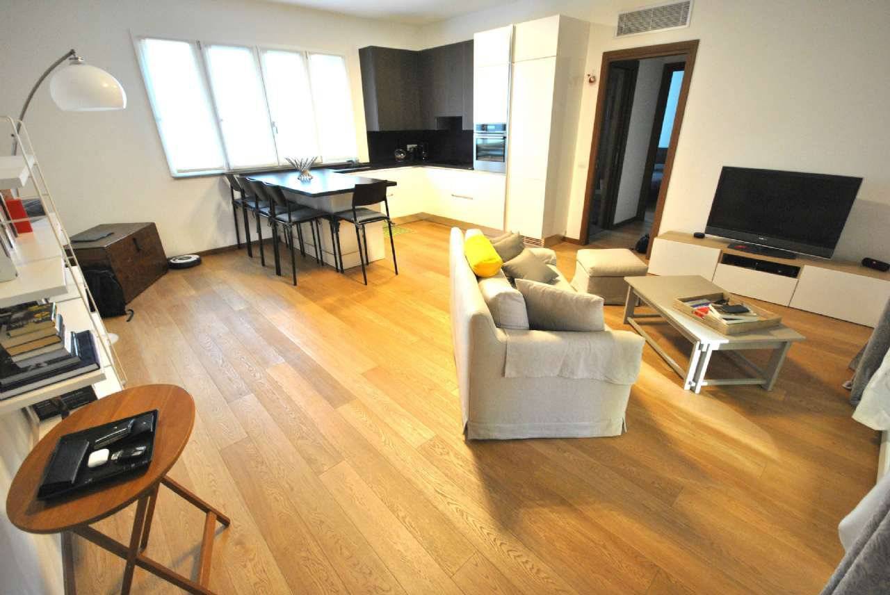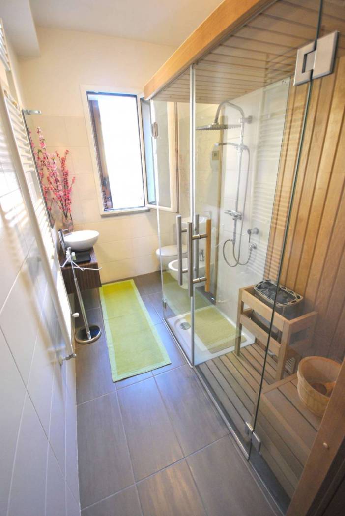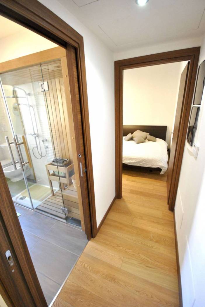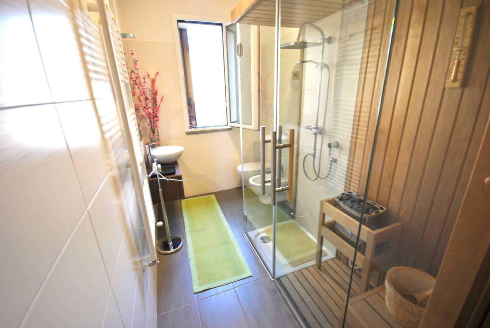 Appartamento così composto: luminoso soggiorno doppio con cucina a isola ad induzione, LOGGIA di 15 mq con zanzariere automatiche e possibilità di chiuderla con vetro automatizzato per sfruttarla anche d'inverno, bagno con doccia e SAUNA, camera matrimoniale.